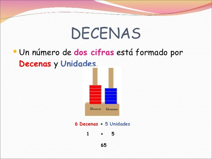 Descomposición en unidades y decenas del número: 23Al número de las decenas le añadimos un cero y sumamos elnúmero de las unidades23 = 2 decenas y 3 unidades = 20 + 3Gráficamente:Unidades:Decenas: